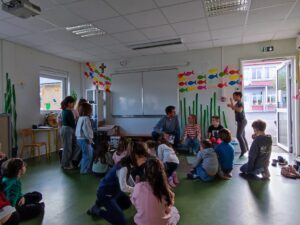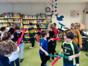 Les classes de CE-CE1 (Sandrine) et CE1-CE2 (Gaëlle et Catherine) poursuivent le travail autour de la thématique des contes. A partir de l’album de jeunesse Le loup est revenu ! , de Geoffroy de Pennart, ils découvrent d’autres pratiques musicales. Ils expriment les émotions qu’éprouvent les personnages, chantent le loup et les joies d’un grand repas, et font des rythmes avec les boomwhackers.