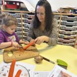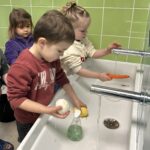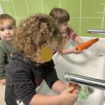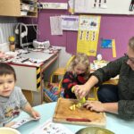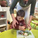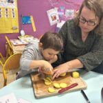 Le lundi matin, place à la réalisation de la recette ! Les élèves ont compté et nommé les légumes, les ont lavés, puis ont découvert et nommé les ustensiles de cuisine. Ils ont ensuite participé à l’épluchage et à la découpe des légumes, en toute sécurité.