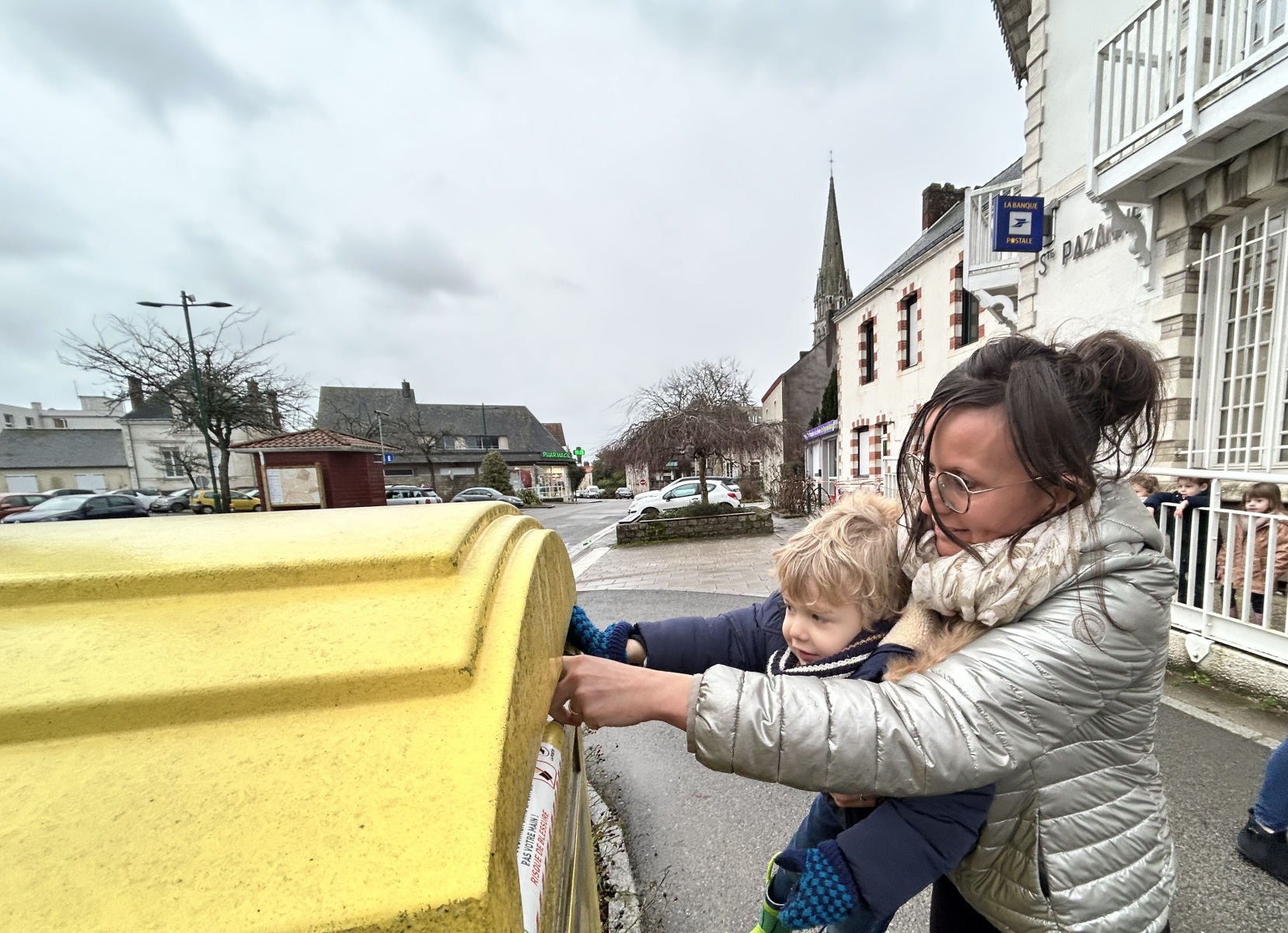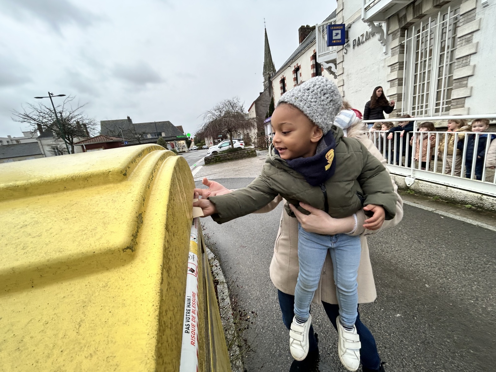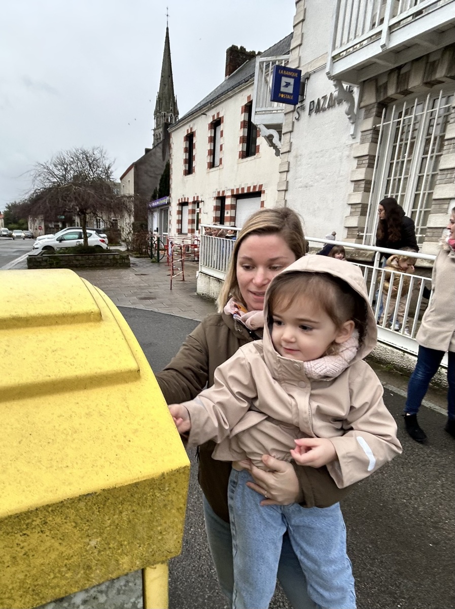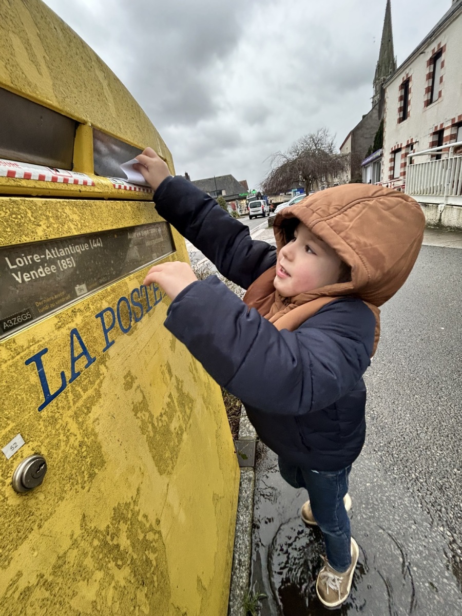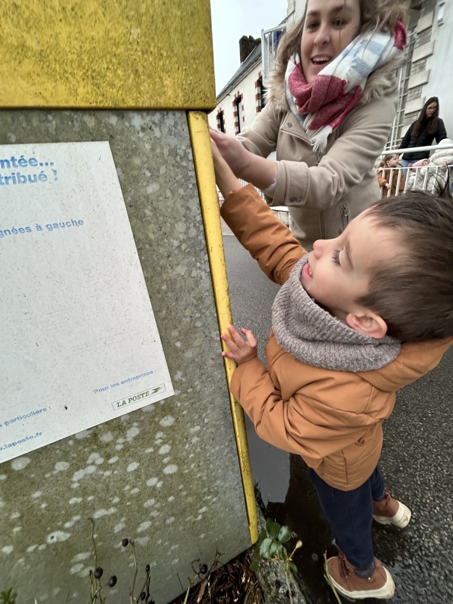 Puis, direction la poste ! Une sortie riche en découvertes, durant laquelle la maîtresse nous a expliqué le rôle du facteur : il vient récupérer le courrier et le dépose ensuite dans la boîte aux lettres, à la bonne adresse.