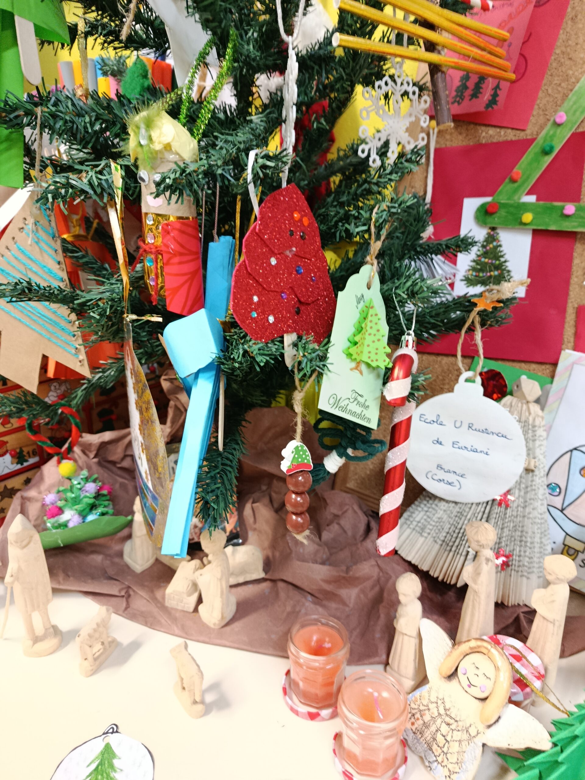 La classe a participé à un échange de décorations de Noël avec 24 écoles européennes. Nous avons envoyé une lettre à chaque école et reçue de chaque école. Ces décorations nous ont permis de découvrir les cultures de plusieurs pays et de lire les messages en anglais. Maintenant nous savons que les espagnols reçoivent leurs